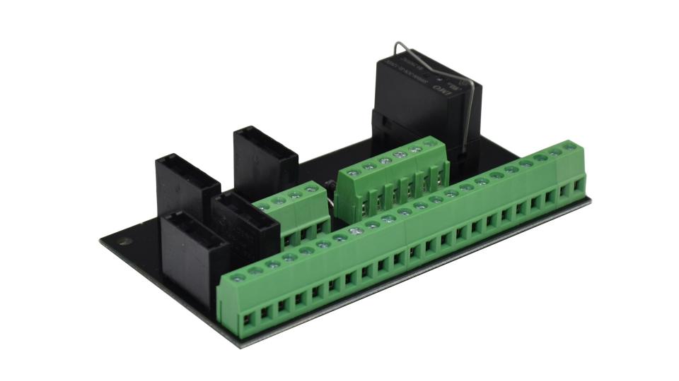 Carte avec relais by pass 8A. Jusqu’à 17 entrées TOR. Bornier à vis 1.5². Relais sur support permettant son changement sans démontage. Multi-tension Vcc par changement du relais. 3 sorties + alim. avec protection via fusible DIN72581 / SAE J 1284. Diodes 1A.