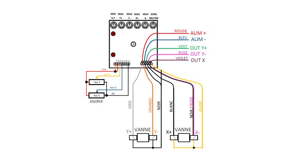 Le module de puissance joystick commande directement 2 vannes proportionnelles sur l’axe Y, 2 vannes proportionnelles sur l’axe X et 3 vannes TOR. L’ouverture de chaque vanne est indépendante de la tension d’alimentation et de la température de l’huile car le module régule le courant consommé par chaque vanne. Sur les 2 axe Y et X, les ouvertures minimum et maximum de chaque vanne proportionnelle sont réglées par 2 potentiomètres. Une zone neutre, autour du point de repos du joystick dans laquelle les vannes ne sont pas commandées, est réglable par un potentiomètre. 2 leds rouges clignotantes intégrées en face arrière indiquent le bon fonctionnement du module (1 pour chaque axe).